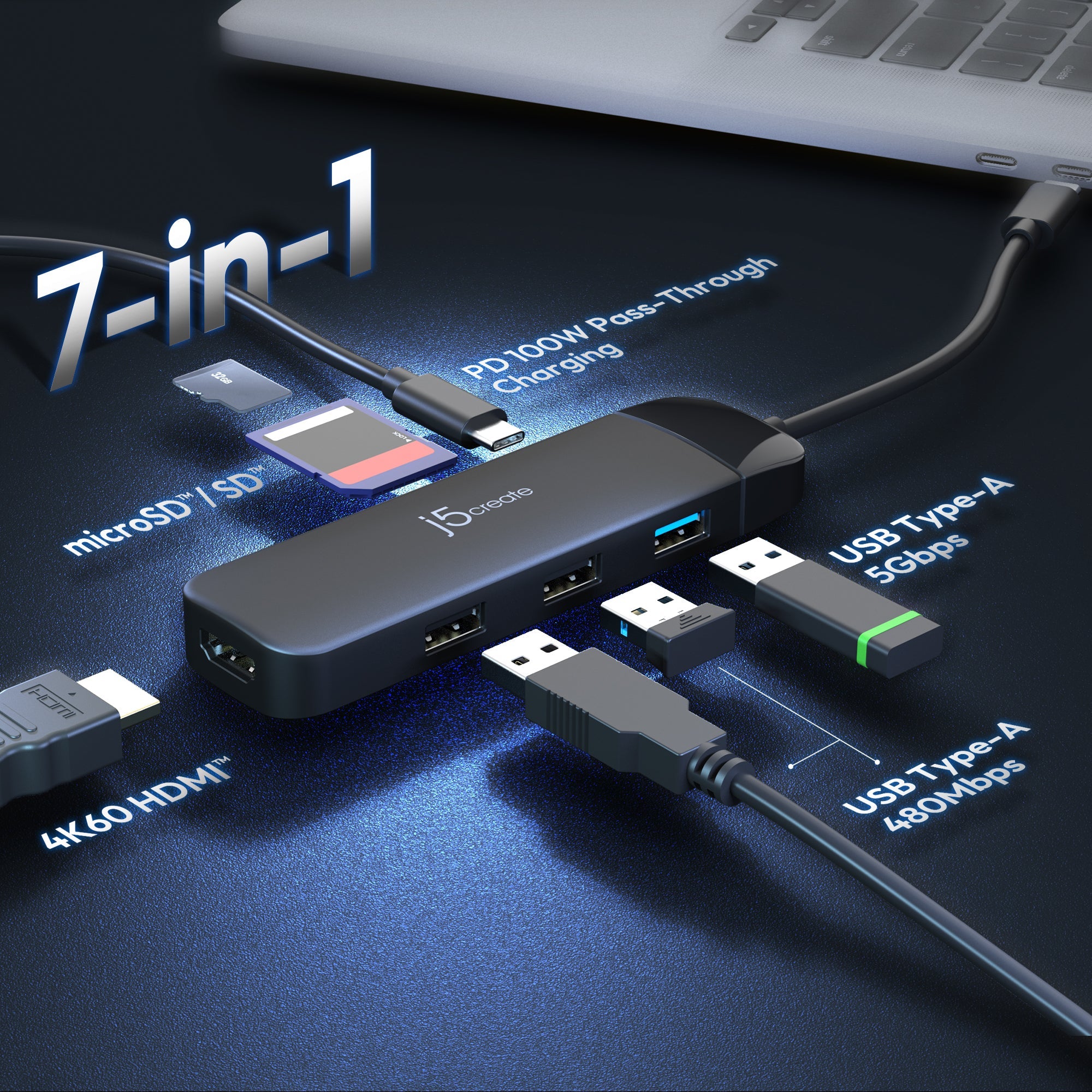 4K60 HDMI™, microSD™ / SD™ slots, triple USB-A ports (up to 5Gbps), and PD charging combined into one powerful, high-speed hub.